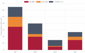 تحلیل محتوای گزارشها نشان میدهد که بحران حقوق بشر، با وجود فراگیری آن، برای اقوام مختلف به شیوهی متفاوت بازنمایی شده است. گزارشهای مرتبط با پشتون ها و به ترتیب سایر اقوام بر محور کنشگری سیاسی و تحولات امنیتی متمرکز بودهاند. در مقابل، روایت مربوط به جامعه هزاره و به ترتیب سایر اقوام به شکلی معنادار با گفتمان حقوق بشر گره خورده است. تحلیل آماری نشان میدهد که ۶۵٪ از کل گزارشهای مرتبط با هزارهها، مستقیما به نقض حقوق بشر پیوند دارد؛ این رقم بالاترین همبستگی را در میان تمام گروههای قومی نشان میدهد. موضوعاتی چون «کوچ اجباری» و «حقوق زنان» در این چارچوب روایت، برجستگی ویژهیی دارند.