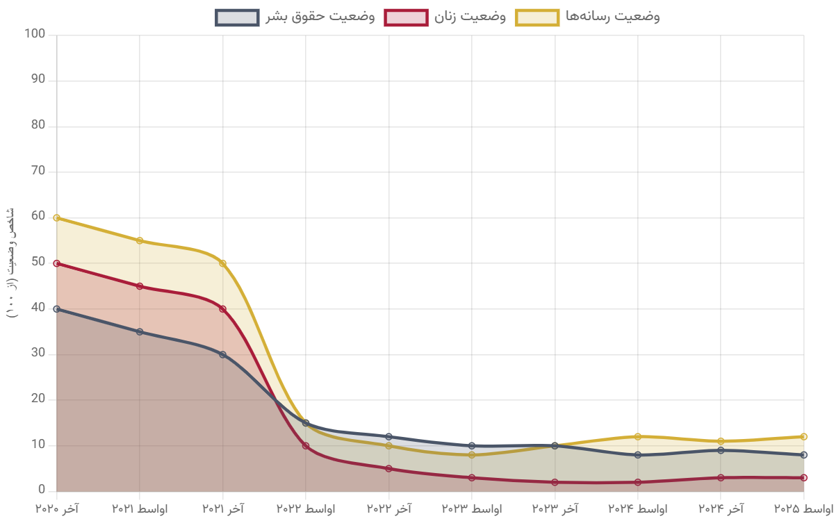 دادههای زمانی استخراجشده از گزارشها، نشاندهندهی یک افت شدید و ساختاری در شاخصهای کلیدی جامعه پس از سقوط جمهوریت است. در آستانه سال ۲۰۲۱، شاخصهای «وضعیت حقوق بشر»، «وضعیت زنان» و «وضعیت رسانهها» در سطح شکننده اما فعال قرار داشتند. با این حال، دادهها سقوط سریع و عمیق را پس از آگست ۲۰۲۱ ثبت کردهاند: شاخص وضعیت زنان از ۵۰ به ۳، شاخص حقوق بشر از ۴۰ به ۸، و شاخص رسانهها از ۶۰ به ۱۰ تنزل یافته است. این ارقام نمایانگر یک فروپاشی ساختاری در عرصههای مدنی، حقوق بشر، زنان و آزادی بیان در کشور است که پیامدهای انسانی گسترده به همراه داشته است.